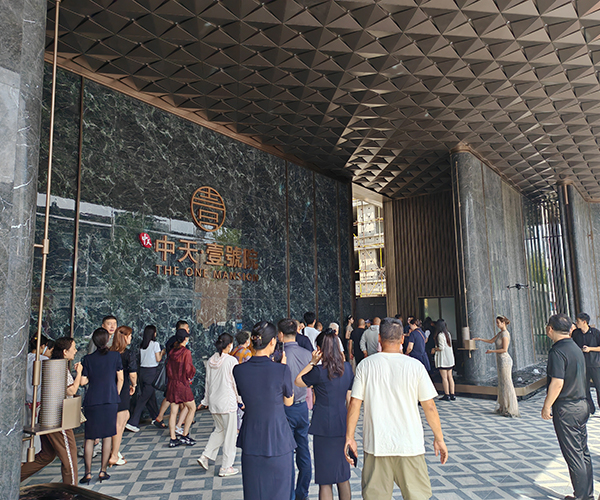 儀式現(xiàn)場(chǎng),熱情高漲的客戶早已匯聚于這座流光溢彩的東大門前。以名貴理石精工筑就、星空頂熠熠生輝、水幕墻靈動(dòng)瀉玉、噴泉水系恭迎貴賓的“星幕尊邸門”,其本身即是歸家尊崇儀式的開篇序章,成為令人矚目的視覺地標(biāo)。人群中,既有開盤即購(gòu)房的業(yè)主,滿懷憧憬前來借鑒設(shè)計(jì)靈感,為未來愛家描繪藍(lán)圖;亦有眾多意向濃厚的準(zhǔn)業(yè)主,翹首以盼親身體驗(yàn)升級(jí)品質(zhì),為理想生活尋覓最契合的空間載體。