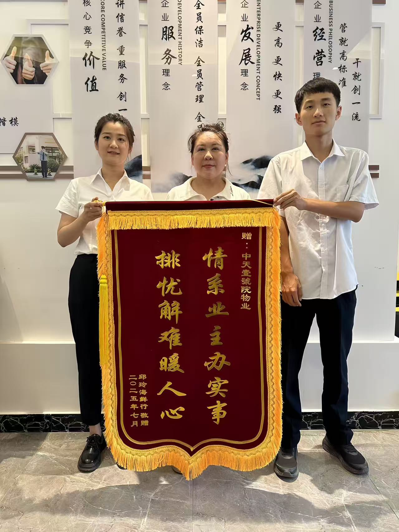 2025年7月12日,壹號院小區(qū)門市業(yè)主邱女士帶著一面寫有“情系業(yè)主辦實事 排憂解難暖人心”的錦旗,送到了小區(qū)物業(yè)服務中心,向物業(yè)工作人員及管家表達感謝。接下來,就讓我們一起走進錦旗背后的故事吧!
