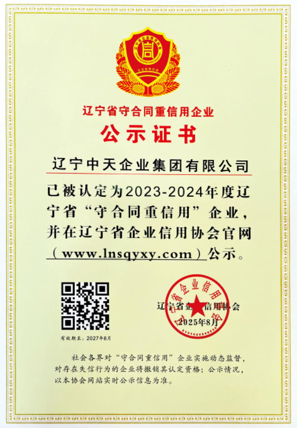 近日,中天集團憑借卓越的商業(yè)信譽和嚴謹?shù)穆募s能力,被遼寧省企業(yè)信用協(xié)會認定為2023-2024年度遼寧省“守合同重信用”企業(yè)和信用等級5A級企業(yè),這是集團自2005年以來連續(xù)20年獲此殊榮。這一榮譽不僅是對集團長期以來堅持誠信經(jīng)營的高度認可,更是對企業(yè)在打造品牌、服務社會方面不懈追求的充分肯定。
