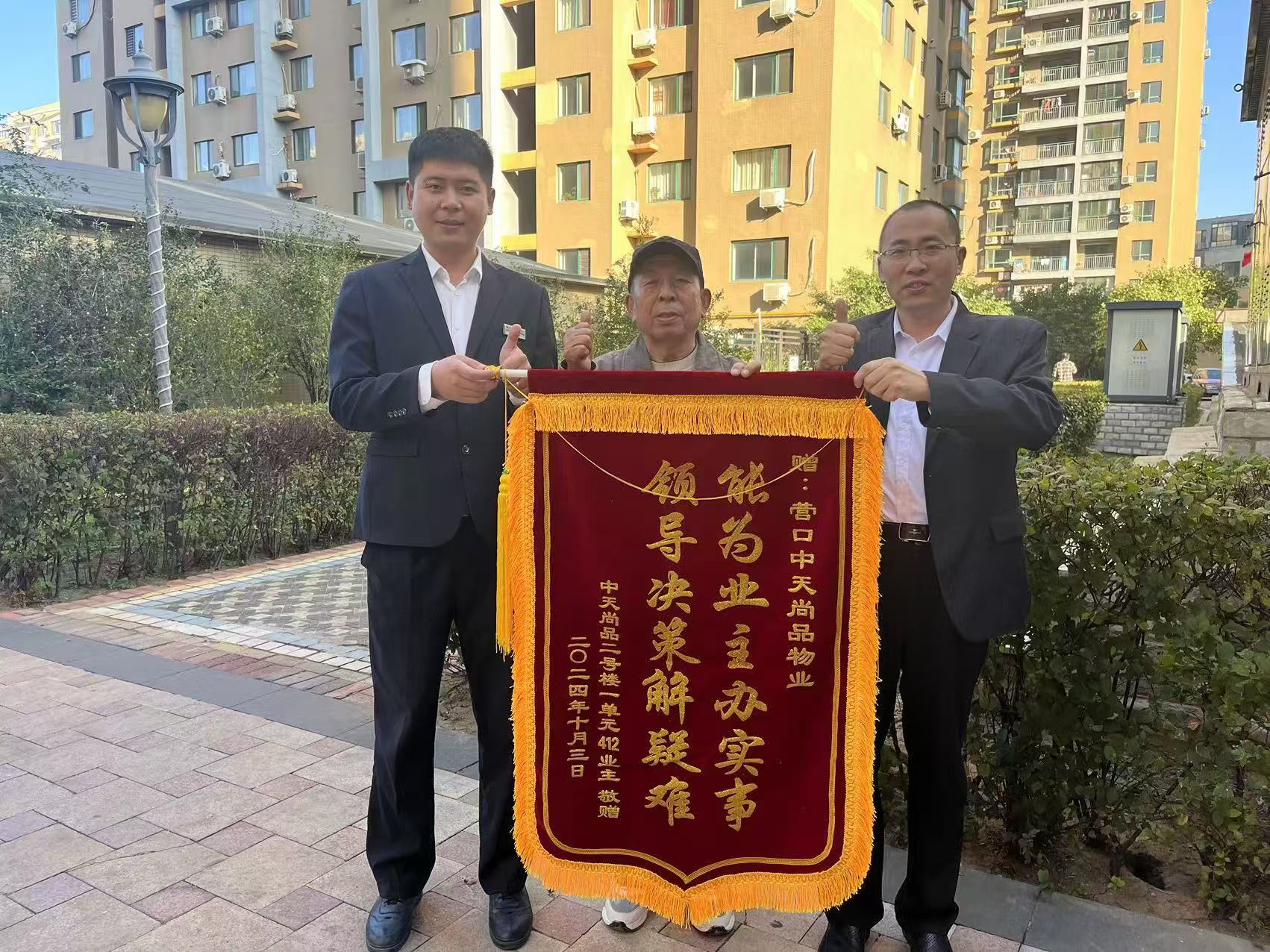好物業(yè),不僅盡力,而且盡心,對業(yè)主盡心、對工作盡心,業(yè)主才能更貼心、放心、省心、傾心。近日,中天尚品物業(yè)迎來了2號樓1單元404的業(yè)主,業(yè)主手握一面印有“能為業(yè)主辦實事,領(lǐng)導(dǎo)決策解疑難”鎏金大字錦旗,贈送中天尚品小區(qū)物業(yè)部,一聲感謝暖人心懷,一面錦旗彰顯擔(dān)當(dāng)。中天物業(yè)人用真情和行動,為呈現(xiàn)有溫度的鄰里生活全力以赴。