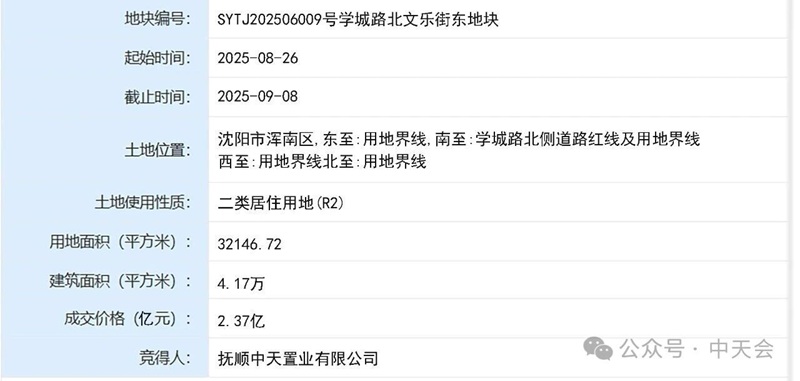 2025年9月8日,遼寧中天企業(yè)集團旗下?lián)犴樦刑熘脴I(yè)有限公司以2.37億成功斬獲備受矚目的沈陽市渾南區(qū)核心板塊長青學(xué)城路北、文樂街東地塊,標(biāo)志著中天集團成功進軍沈陽市,進一步實現(xiàn)布局遼寧的戰(zhàn)略構(gòu)想,企業(yè)戰(zhàn)略發(fā)展版圖再擴張。